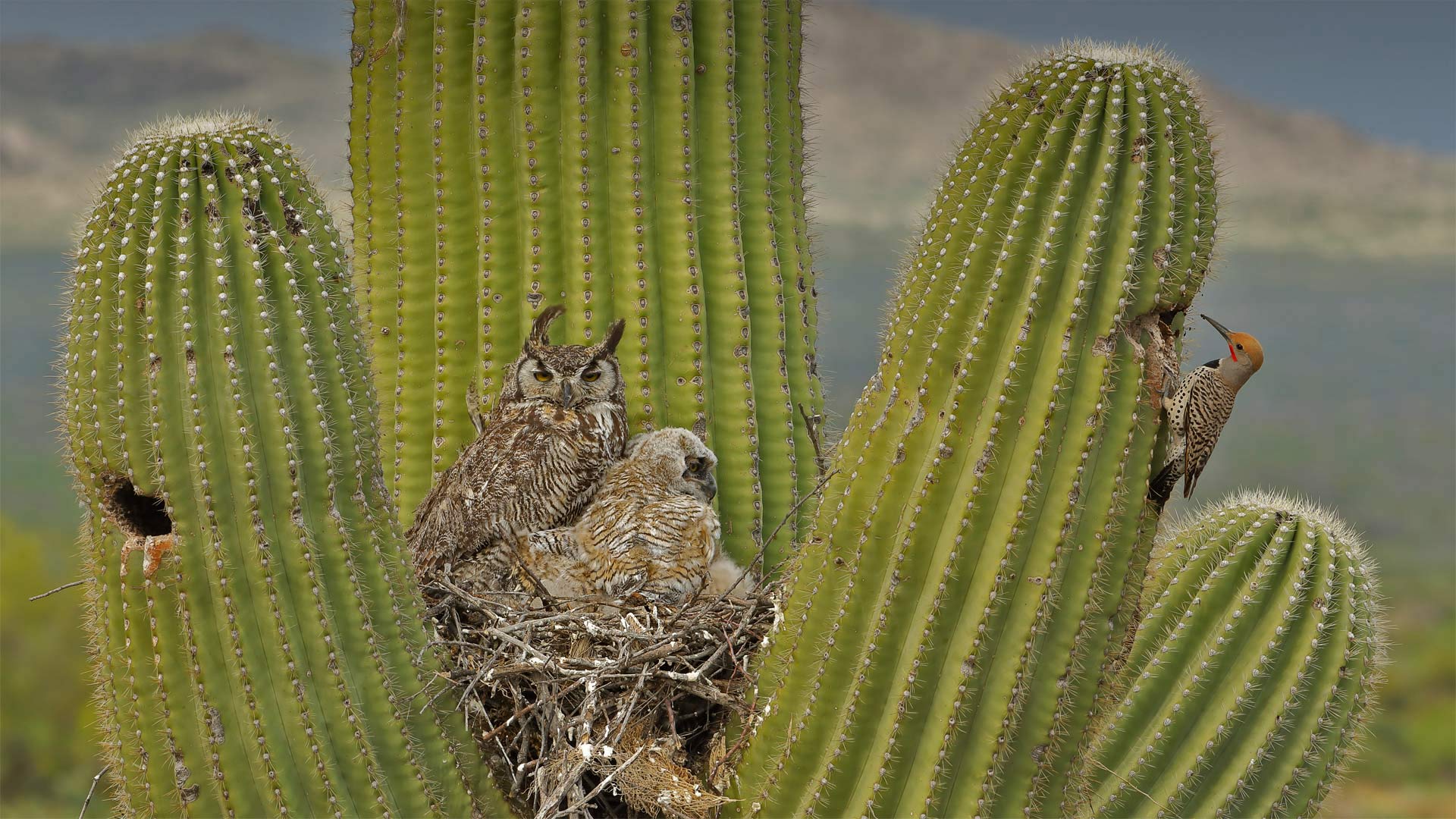 Great horned owls and a gilded flicker on a saguaro cactus in the Sonoran Desert